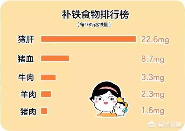 Les aliments d'origine animale sont riches en fer et l'absorbent facilement, comme le sang de porc, le foie, le gésier de poulet, les rognons de vache, etc. contenant >10mg/100g ; la viande maigre, la cassonade, les jaunes d'œuf, les rognons de porc, les rognons de mouton, les fruits secs, etc. contenant >5mg/100g.
