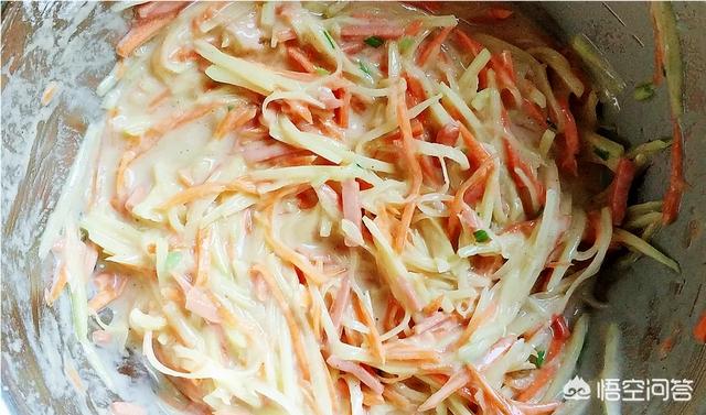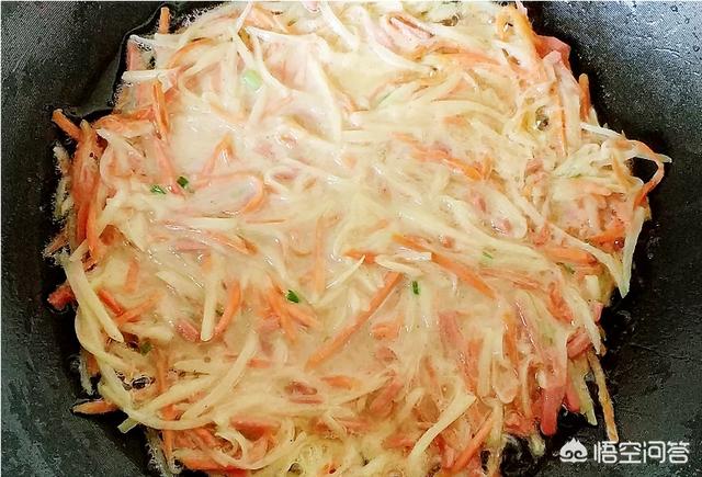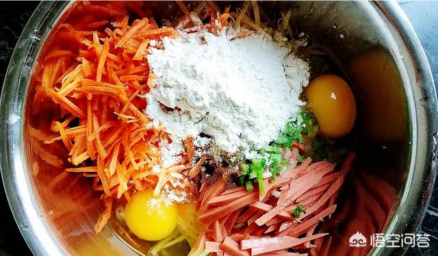 3. Mettre les pommes de terre râpées, les carottes râpées et la saucisse de jambon coupée dans une petite casserole, battre deux œufs, mettre la bonne quantité de sel, la poudre de cinq épices, ajouter un peu d'eau, ajouter un peu de farine ;