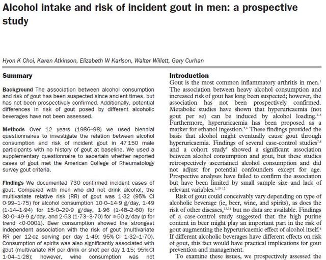 Littérature publiée dans Lancet en 2004 ; Lancet, une revue, peut être considérée comme le sommet du sommet de la médecine clinique, comme la Rolls-Royce des voitures, et quiconque publie un article dans cette revue peut être soufflé pour toute une vie. L'article a pris 12 ans pour observer plus de 40.000 personnes (note : aucune des 40.000 personnes n'avait eu une crise de goutte au moment de l'inscription). La conclusion finale est que plus la consommation d'alcool est importante, plus le risque de goutte est élevé. La consommation de bière et de spiritueux entraîne un risque accru de goutte, mais pas celle de vin rouge.