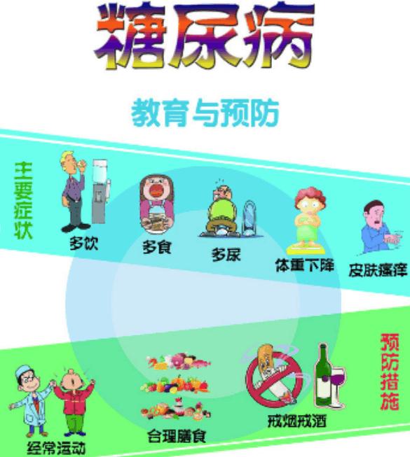Il existe de nombreux facteurs de risque de diabète sucré, tels que des antécédents familiaux de diabète sucré, de mauvaises habitudes alimentaires, une activité physique réduite, l'obésité, une forte consommation d'alcool, le stress mental, etc. Mesures préventives : (1) Prévenir et corriger l'obésité. (2) Éviter les régimes riches en graisses. (3) Régime alimentaire permettant d'atteindre un poids raisonnable et de répondre aux besoins du travail et de la vie. La composition des aliments est raisonnable, les hydrates de carbone non raffinés, riches en vitamines solubles, représentent 50 à 65 % des calories totales des aliments, les graisses représentent 15 à 20 % des calories totales des aliments (rapport entre les acides gras polyinsaturés et les acides gras saturés supérieur à 1,5), et les protéines représentent 10 à 15 % des calories totales des aliments. Mangez plus de légumes. (4) Augmenter l'activité physique et participer à des exercices physiques. (5) Éviter ou utiliser moins de médicaments défavorables au métabolisme du sucre. (6) Dépister et traiter activement l'hypertension, l'hyperlipidémie et les maladies coronariennes. (7) Abandonner les mauvaises habitudes telles que le tabagisme et la consommation d'alcool. (8) Contrôler régulièrement la santé des personnes d'âge moyen et des personnes âgées, en plus de la glycémie à jeun de routine, prêter attention à la mesure de la glycémie postprandiale dans les deux heures. Symptômes précoces : (1) Cavité buccale : bouche sèche, soif, boire beaucoup d'eau, pétéchies, pétéchies, œdème, gencives gonflées et douloureuses, douleur au niveau des dents ou sensation de brûlure dans la cavité buccale ; (2) Poids corporel : perte de poids lente, sans facteur de causalité évident ; (3) Force physique : fatigue, et souvent sensation de faim, transpiration, fatigue, palpitations, tremblements, hypoglycémie ; (4) urine : miction fréquente et miction excessive chez les hommes ; (5) paupières : néoplasme jaune et plat (tumeur maculaire) sous les paupières ; (6) peau : ulcération prolongée des membres inférieurs et des pieds ; ou infections cutanées et vulvaires récurrentes ; abrasions ou égratignures cutanées qui ne guérissent pas facilement ou épisodes récurrents d'inflammation du gland, de la vulve, de vaginite ; (7) vaisseaux sanguins : artériosclérose, (8) Reproduction : femmes ayant subi des fausses couches multiples, un empoisonnement gestationnel, un excès de liquide amniotique ou l'accouchement d'un fœtus de grande taille.