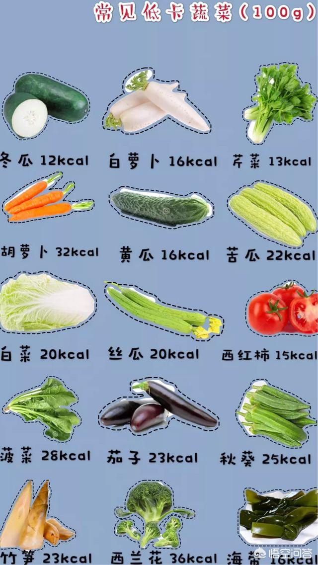 Les légumes hypocaloriques les plus courants sont le melon d'hiver, le céleri, le concombre, la carotte, le melon amer, la courge, le chou, le radis blanc, la tomate, le gombo, l'aubergine, l'épinard, les pousses de bambou, le brocoli et les algues.