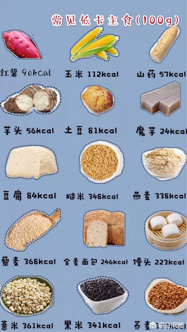 Parmi les aliments de base hypocaloriques les plus courants, citons le maïs, les ignames, le taro, les haricots mungo, les patates douces, les pommes de terre, le pain de blé complet, l'avoine, le riz brun, le konjac, le tofu, le quinoa, les petits pains cuits à la vapeur, le sarrasin, l'orge et le riz noir.
