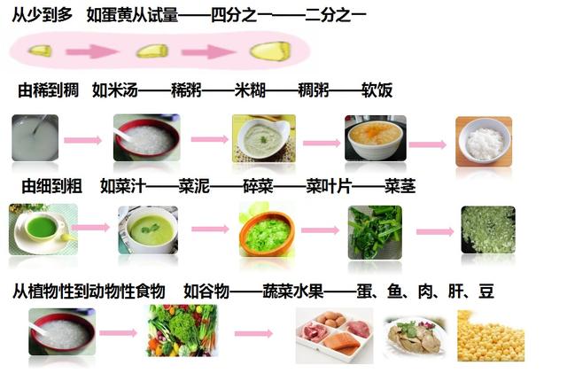 De fin à gros, de mince à épais, de peu à beaucoup, de simple à légume, de légume à fruit, de fruit à viande.Chaque type d'aliment complémentaire doit être surveillé de près afin de détecter toute intolérance ou non-absorption, ce qui se reflète généralement dans les selles, puis ajouté lentement et sans précipitation excessive.