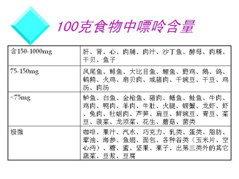 Chez les personnes normales, l'organisme peut éliminer la purine par les reins et les intestins en peu de temps en cas d'ingestion d'une grande quantité de purine, mais chez les patients souffrant d'hyperuricémie ou de goutte, l'ingestion d'une quantité excessive de purine ne fera qu'aggraver leur état. Par conséquent, les patients doivent choisir leurs aliments en fonction de leur état de santé, sous la supervision de leur médecin.La teneur en purine des aliments est la suivante : abats > viande > poisson > haricots secs > noix > légumes à feuilles > céréales > fruits.