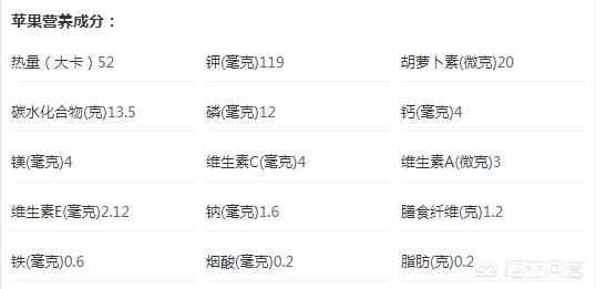 Les pommes contiennent des sucres, des fibres alimentaires, de la vitamine A, de la vitamine C, du carotène, de l'acide malique, du fer, du phosphore, du potassium, du magnésium, du sélénium et d'autres nutriments. Les polyphénols et les flavonoïdes contenus dans les pommes peuvent réduire l'incidence du cancer du poumon et prévenir le saturnisme ; les acides de fruits et les vitamines contenus dans les pommes peuvent rendre la peau délicate et hydratée et retarder l'apparition des taches de vieillesse.