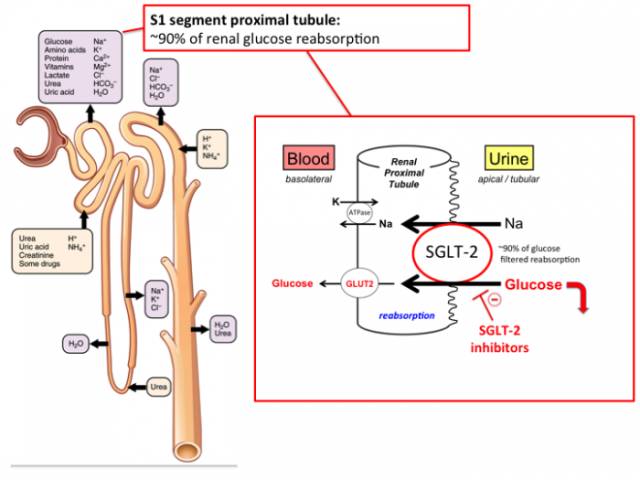 En général, la glycémie humaine est supérieure à 10 mmol/l (seuil rénal de glucose) et le glucose est évacué par l'urine ; si la glycémie est supérieure au seuil rénal de glucose, la quantité de glucose évacuée est plus importante ; la situation générale permet donc de maintenir la glycémie stable et l'excès de glucose est évacué par l'urine. Le glucose pénètre dans le tubule rénal, principalement par la paroi tubulaire rénale de la protéine 2 du cotransporteur sodium-glucose, qui le réabsorbe dans le sang ; en fait, la protéine 2 du cotransporteur sodium-glucose équivaut aux transporteurs urinaires du glucose.