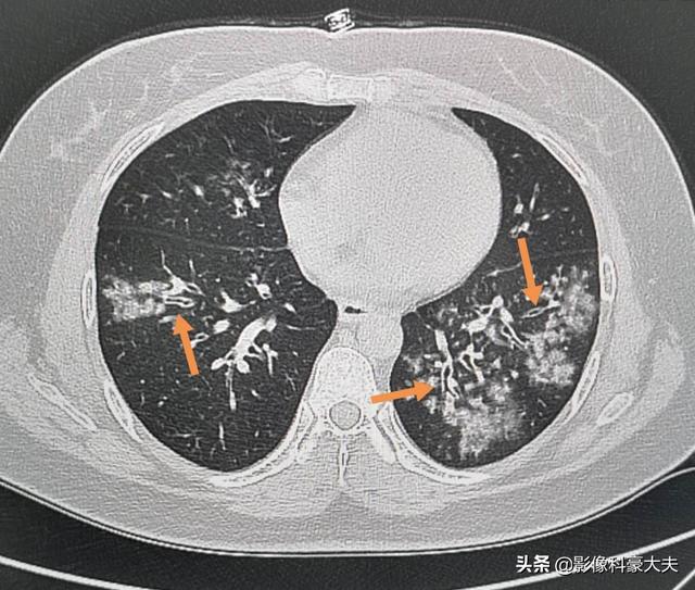 C'est le cas de cette jeune femme qui toussait et avait de la fièvre avec peu d'expectorations et qui ne se portait pas bien avec les médicaments contre le rhume et la grippe. Un scanner a été réalisé et a révéléL'inflammation par plaques dans les deux poumons avec de multiples petits épaississements de la paroi des voies respiratoires et une distribution centrée des foyers dans les voies respiratoires correspond à une pneumonie à Mycoplasma et non à une pneumonie néocoronarienne.