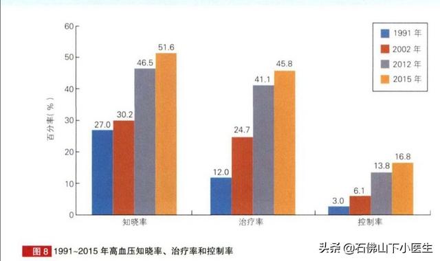 Cependant, l'État consacre actuellement beaucoup d'efforts à la prévention et au traitement de l'hypertension. Comme le montre la figure ci-dessous, en 1991, 2002, 2012 et 2015, les taux de sensibilisation, de traitement et de contrôle de l'hypertension ont augmenté au fil du temps, mais comme le montrent les données, bien que ces chiffres soient en augmentation, ils ne sont pas très élevés, en particulier le taux de contrôle, qui n'était que de 16,8 % en 2015, et des efforts continus sont encore nécessaires pour populariser le sujet.
