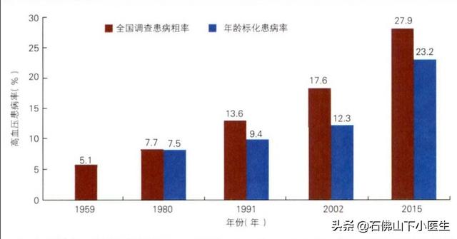 Comme le montre le graphique ci-dessous, la Chine a effectué cinq recensements nationaux de l'hypertension en 1959, 1980, 1991, 2002 et 2015, et comme vous pouvez le voir sur le graphique ci-dessous, les barres rouges et bleues ont augmenté à chaque recensement.