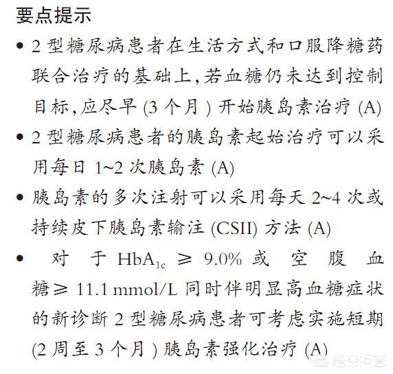 2) Pour les patients diabétiques qui ne parviennent toujours pas à contrôler efficacement leur glycémie (taux d'hémoglobine glyquée toujours supérieur à 7,0 % après 3 mois) sur la base de 2 ou plusieurs hypoglycémiants oraux grâce à des interventions de vie renforcées, l'insuline à domicile peut être envisagée pour améliorer encore le contrôle de la glycémie.