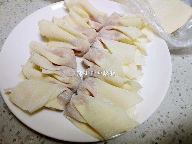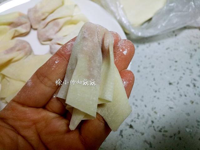 2. L'emballage des wontons est en fait très simple, le but ultime étant d'envelopper la farce de viande dans la ligne. Je place généralement la farce au milieu de la peau du wonton, je la plie, puis je la presse jusqu'au milieu.