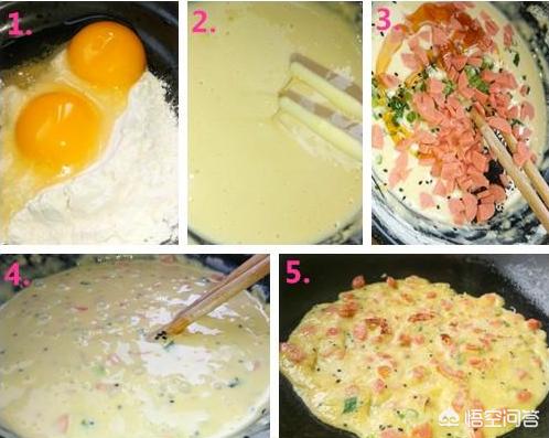 Verser la farine dans un bol, battre deux œufs (Image 1), mélanger avec de l'eau pour former une pâte (Image 2), ajouter les dés de jambon hachés, l'oignon vert haché, les graines de sésame, un peu de sel et l'huile de sésame (Image 3), bien mélanger (Image 4), mettre en attente, verser l'huile dans une poêle, faire chauffer pendant sept ou huit minutes lorsqu'une grande cuillère de pâte est versée dans la poêle, utiliser le dos de la spatule pour étaler la pâte finement (vous pouvez également utiliser une spatule), et faire frire jusqu'à ce qu'ils soient dorés des deux côtés (Image 5). ) peut être sorti de la poêle sur une assiette, coupé dans votre forme préférée peut commencer Oh !