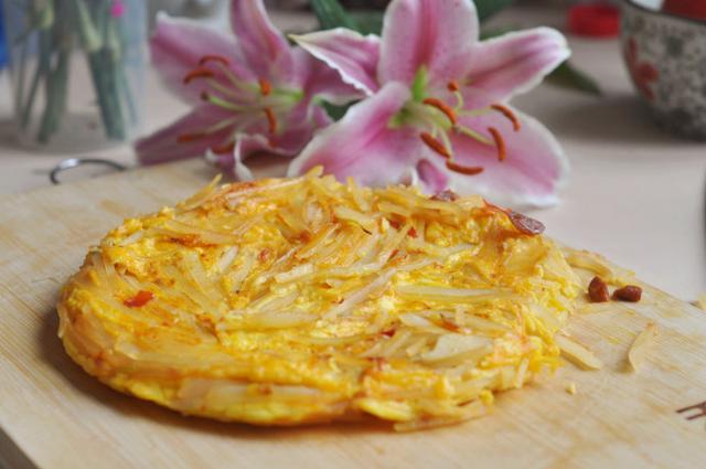 Couper les pommes de terre et les carottes épluchées en julienne, les mélanger à la farine et au sel, faire chauffer une poêle à frire et y verser un peu d'huile d'olive. Battre les œufs avec un filet de vin de Shaoxing. Lorsque la poêle est chaude, ajouter les pommes de terre râpées et les faire frire à feu moyen, retourner la poêle lorsqu'un côté est doré, retourner la poêle, verser le mélange d'œufs et faire frire jusqu'à ce que l'autre côté soit doré.