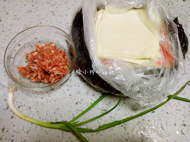 1, farce à la viande (préparée la veille : viande hachée, sel, sauce soja, échalotes hachées, gingembre haché, poudre de cinq épices), peaux de wonton, persil, nori, etc.