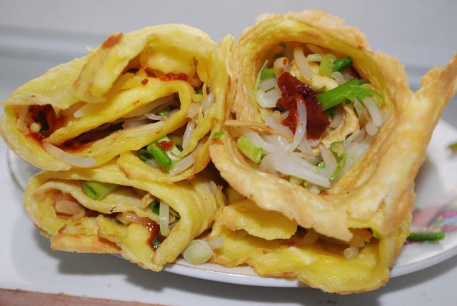 Battre un œuf et le mélanger à un peu de farine pour obtenir une pâte. Faire chauffer un peu d'huile dans une poêle à frire ou faire fondre le beurre, verser la pâte dans la poêle, faire une crêpe fine et éteindre le feu quand elle est dorée. Garnissez-la d'une ou deux tranches de fromage et de jambon et roulez-la. Cette crêpe est beaucoup plus nutritive que les crêpes enveloppées dans des beignets que l'on trouve sur les étals de rue. Cela prend 5 minutes.