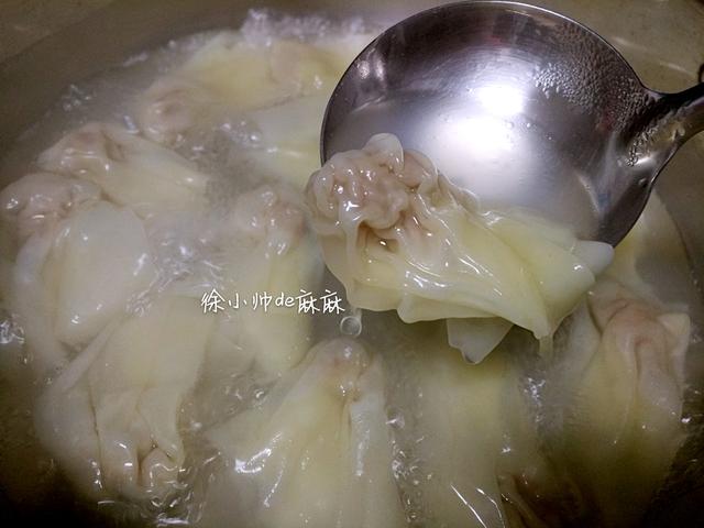 4 : Faire bouillir de l'eau, d'abord une cuillerée d'eau bouillante pour diluer un peu la base de la soupe, les ingrédients se mélangent bien. Ajouter ensuite les wontons et les faire cuire jusqu'à ce qu'ils flottent, environ trois minutes. Après la cuisson des raviolis dans un bol, les raviolis et la base de soupe peuvent être mélangés.