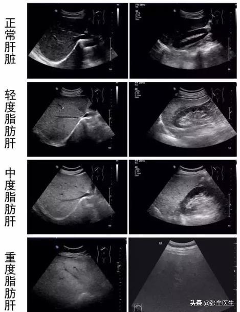 ● Certains d'entre vous se demanderont peut-être comment faire pour distinguer s'il s'agit d'une stéatose hépatique légère ou sévère ou grave ? En fait, comme je l'ai mentionné dans le paragraphe d'introduction, il s'agit d'une constatation rapportée sur l'imagerie qui...Il y a donc plus de subjectivité.D'une manière généraleS'il est douxL'échographie comprend une stéatose hépatique inhomogène. Le foie est de taille normale avec une forte échogénicité parenchymateuse, le champ postérieur est clair et les structures canalaires sont montrées et amincies ;si modéréA l'échographie, le volume hépatique est important, l'angle marginal hépatique est émoussé, les échos parenchymateux sont finement rehaussés avec une légère atténuation dans le champ postérieur, les structures tubulaires sont peu visibles et amincies, et il y a un contraste important entre le foie et les reins.Dans les cas graves, le foie présente une morphologie pleine et une taille nettement augmentée à l'échographie, avec des angles marginaux hépatiques arrondis, des échos parenchymateux finement renforcés sous forme de nuages, une atténuation dans les champs moyen et postérieur, des structures tubulaires peu visibles et une augmentation du contraste entre le foie et les reins.