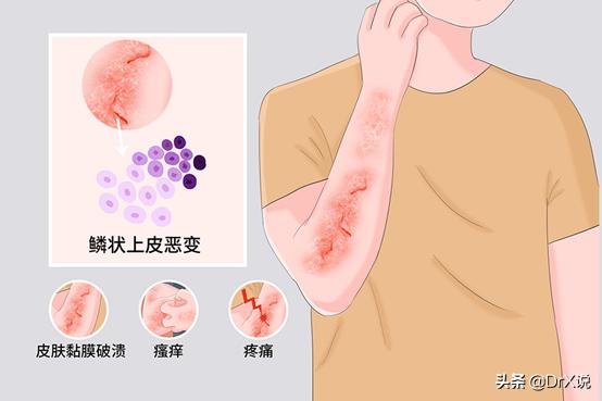 Carcinome cutané squameux : le carcinome cutané squameux survient dans la zone d'exposition des personnes âgées ; il s'agit d'abord d'une éruption cutanée, de petits nodules rouges et durs aux limites floues, qui évoluent lentement vers des verrues ou des papillomes, dont la surface est écailleuse ; la partie centrale de la peau est facilement ulcérée ; la surface de l'ulcère est granuleuse et peut facilement se nécroser et saigner ; le bord de l'ulcère est plus large et présente une forme de chou-fleur, accompagnée d'une odeur nauséabonde.