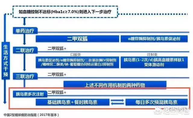 2) Les patients atteints de DT2 peuvent commencer une monothérapie à l'insuline ou une thérapie combinée de médicaments oraux lorsque leur glycémie ne parvient toujours pas à atteindre l'objectif fixé sur la base d'une intervention sur le mode de vie et d'une thérapie combinée de médicaments oraux, ou lorsqu'il existe des contre-indications à l'utilisation de médicaments oraux. En général, l'insulinothérapie peut être initiée lorsque l'HbA1c est >7% après une thérapie combinée avec des doses plus importantes de 2 ou plusieurs médicaments oraux.