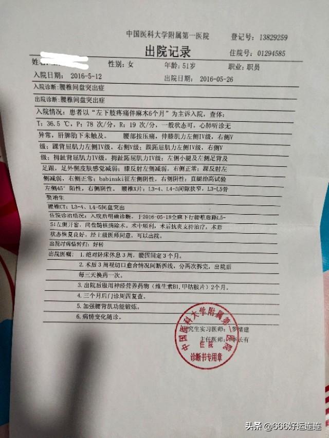 Deux semaines plus tard, j'ai commencé à me lever lentement et à me déplacer sur le sol avec un protecteur lombaire, passant de l'impossibilité de baisser la tête à la possibilité de baisser la tête, de l'impossibilité de s'asseoir à la possibilité de s'asseoir, de l'impossibilité de s'accroupir à la possibilité de s'accroupir, et ce processus doit durer trois mois, et au bout de six mois, je peux pratiquement me déplacer librement.