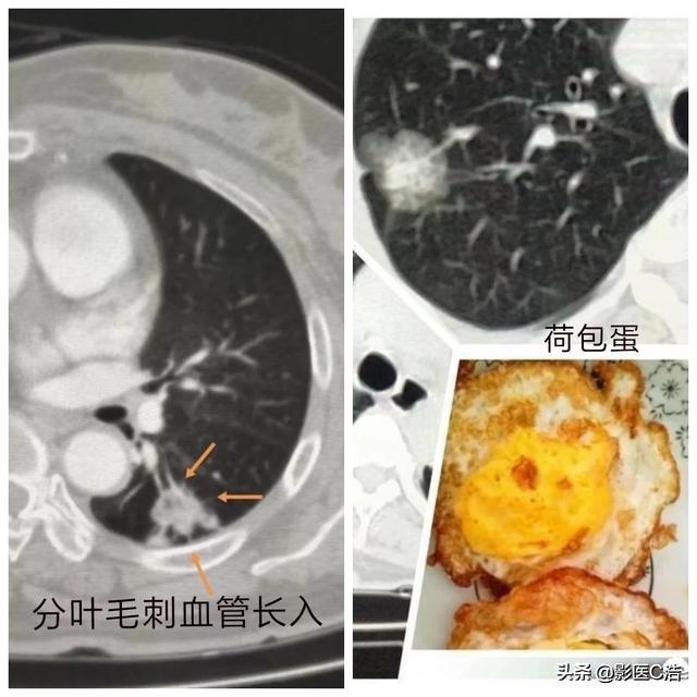 Si les nodules sont malins, ils ont généralement une forme irrégulière, lobulée (les cellules tumorales se développent de manière irrégulière dans toutes les directions), et peuvent être vus comme un signe vacuolaire, un signe de bavure marginale, un signe de vaisseaux sanguins alimentant la tumeur, un signe de dépression pleurale adjacente, et une augmentation de la taille des nodules en verre dépoli ou des composants solides lors de l'examen de suivi, etc.