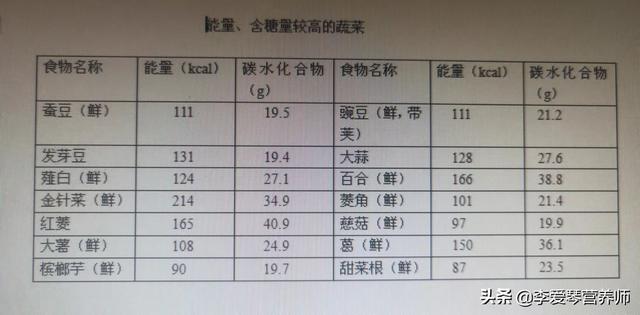 Les légumes les moins riches en sucre sont les légumes verts feuillus et les légumes dont la teneur en sucre est comprise entre 1 et 4 % : chou, chou, céleri, épinard, légumes verts, poireau, courge amère, concombre, melon d'hiver, courge, courgette, tomate, laitue, aubergine, chou-fleur, germes de haricots mungo, champignons frais, riz sauvage, pousses de bambou, etc. Les légumes dont la teneur en sucre est d'environ 4 % comprennent le radis blanc, le kaki, le potiron, etc.