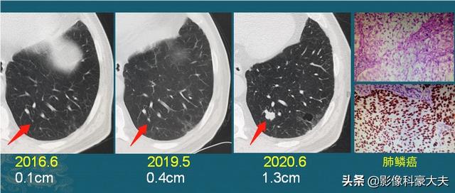 Il s'agissait d'un nodule pulmonaire solide qui est passé de 1 mm à 1,3 cm en 4 ans, et la pathologie chirurgicale a révélé un cancer squameux du poumon.