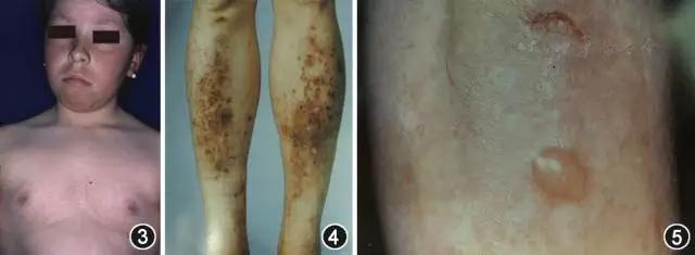Également connue sous le nom de tache tibiale antérieure diabétique. Elle se manifeste chez 9 à 55 % des adultes diabétiques et est rare chez les enfants diabétiques. Les plaques tibiales antérieures apparaissent sur le devant du tibia, les avant-bras, les cuisses et les proéminences osseuses, comme le montre la figure 4. L'éruption commence par une papule ronde ou ovoïde rouge foncé de 0,5 à 1,0 cm, qui s'élargit lentement et peut s'accompagner d'une desquamation, laissant finalement une plaque atrophique brune ou marron clair ressemblant à une cicatrice. Les éruptions individuelles peuvent disparaître après 1 à 2 ans, laissant une légère atrophie, une hypopigmentation ou une hyperpigmentation, mais de nouvelles éruptions continuent souvent d'apparaître. Les plaques tibiales antérieures ne présentent aucun symptôme gênant et peuvent disparaître d'elles-mêmes sans traitement.