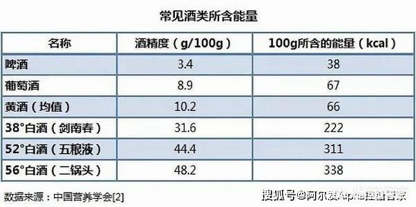 Un gramme d'alcool produit environ 7 kcal d'énergie, et 100 ml (2 taels) de vin blanc à 50° produisent environ 350 kcal d'énergie, soit l'équivalent de 300 grammes de riz bouilli~.