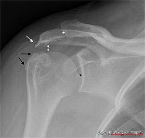 Les douleurs de l'épaule dues au syndrome de l'impaction de la hanche se caractérisent parDouleur associée au mouvement de l'articulation de l'épaule (peut être différenciée de la colonne vertébrale cervicale causant une douleur à l'épaule)Dans certains cas, la douleur peut être provoquée par certains mouvements de soulèvement ou d'abduction des membres supérieurs et, chez certains patients, un cliquetis dans l'épaule est entendu lorsque la douleur est provoquée. Dans ce cas, la présence d'un problème peut souvent être déterminée par une radiographie ou une IRM de l'articulation de l'épaule.Comme vous pouvez le voir ci-dessous, la flèche blanche représente l'ostéophyte de l'acromion dû à l'impaction, et la flèche noire représente l'ostéophyte de la grosse tubérosité de l'humérus, qui impacte l'acromion.(ibid.).