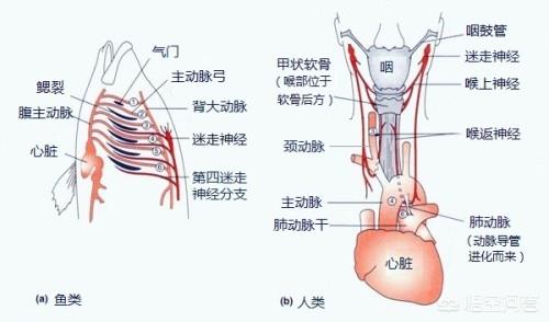 À l'origine, le nerf laryngé récurrent (quatrième nerf vague) et les vaisseaux de la sixième artère parotide du poisson étaient distribués parallèlement à la zone branchiale, et cette structure était simple et rapide, avec un style pragmatique. Cependant, avec l'évolution du cou et la dégradation des branchies, le sixième vaisseau aortique, qui était le vaisseau le plus postérieur des branchies, s'est progressivement déplacé vers l'arrière (vers l'arrière de la tête du poisson) pour devenir l'aorte des êtres humains de nos jours, et le nerf laryngé récurrent, qui s'est développé en même temps que ce vaisseau sanguin, ne pouvait que le suivre vers l'arrière (ou vers le bas dans le cas des êtres humains). Les arcs branchiaux (la partie de l'arrière de la mâchoire inférieure du poisson qui soutient et relie les branchies), qui sont attachés à l'autre extrémité du quatrième nerf vague (le nerf laryngé récurrent), ont évolué pour devenir le pharynx.