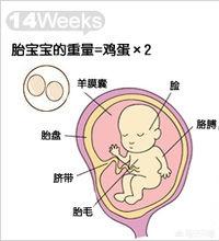 À 14 semaines de grossesse, le fœtus mesure environ 12 cm et pèse 28 g, soit à peu près le poids de deux œufs. À cette période, le fœtus peut être légèrement plus gros, et la paroi antérieure du placenta de la mère enceinte ne laisse entrevoir qu'un petit ventre.