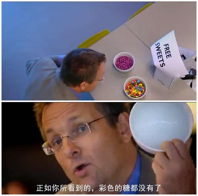 Michael a réalisé cette expérience dans son bureau en plaçant deux barquettes de chewing-gum du même goût sur son bureau, l'une entièrement violette et l'autre aux couleurs de l'arc-en-ciel. Quelques jours plus tard, Michael est revenu et a constaté que les bonbons aux couleurs de l'arc-en-ciel avaient tous disparu, alors qu'il restait encore beaucoup de bonbons violets.