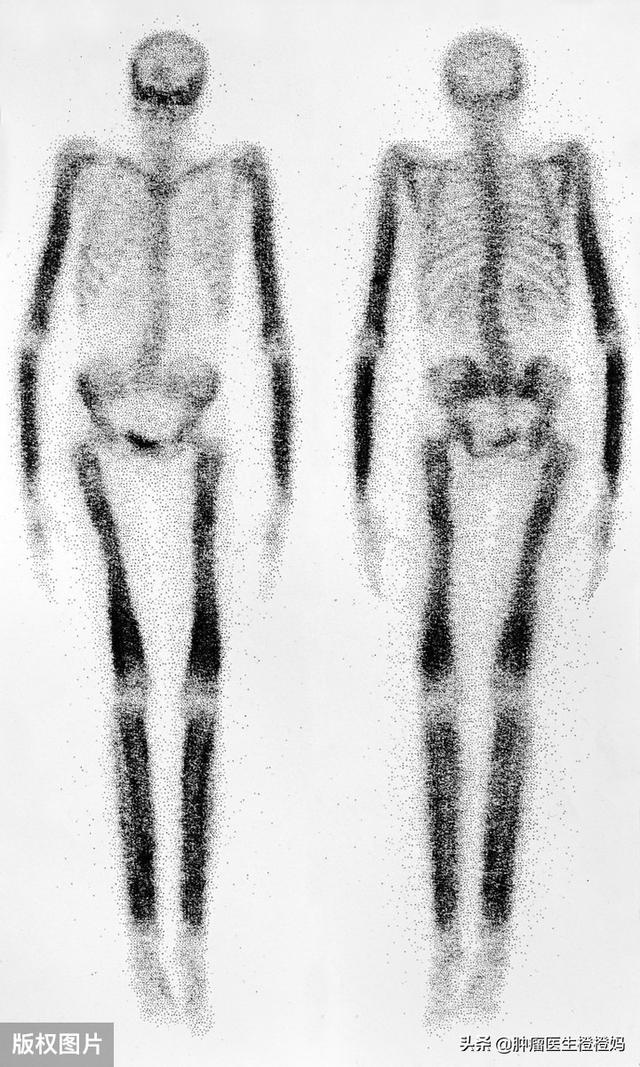 Deuxièmement, sur la base des résultats de l'examen.Les métastases osseuses dues au cancer peuvent apparaître à l'imagerie comme une destruction ostéogénique ou ostéolytique. Elles sont très différentes des lésions osseuses ordinaires. En clinique, nous utilisons généralement la scintigraphie osseuse pour déterminer s'il y a des métastases osseuses.👆👆👆上图中,特别'黑'的地方可能就是骨转移!Bien entendu, si les autres examens ne révèlent aucun foyer primaire, le médecin peut décider de procéder à un examen pathologique du tissu osseux dans la région où l'on soupçonne la présence de métastases osseuses. Cet examen permet d'une part de déterminer s'il s'agit réellement d'une métastase osseuse tumorale maligne, et d'autre part de déterminer l'origine des cellules cancéreuses grâce à la coloration pathologique.