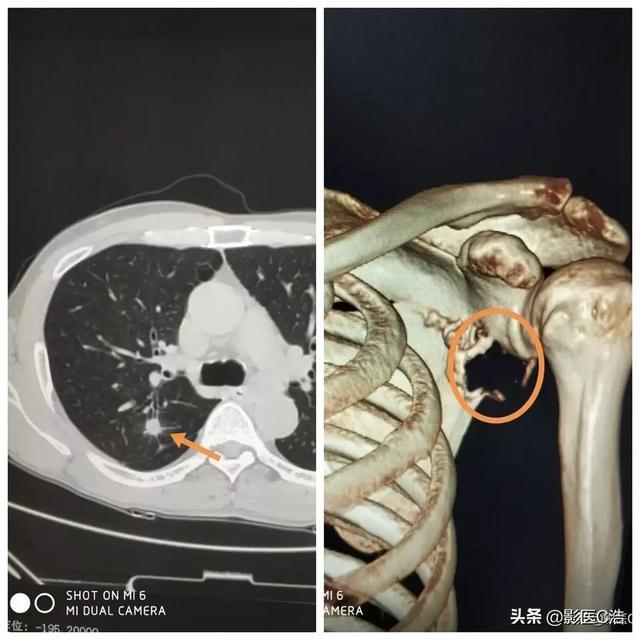 Le cancer peut métastaser dans les os de différentes parties du corps, les plus courantes étant généralement les os du milieu de la colonne vertébrale (c'est-à-dire les vertèbres thoraciques et lombaires), le bassin, les côtes et l'omoplate. La douleur se manifeste dans la partie de l'os où se trouvent les métastases. Par exemple, les métastases au niveau de la colonne lombaire provoquent des douleurs lombaires et les métastases au niveau de l'omoplate provoquent des douleurs à l'épaule. En outre, certains patients consultent un médecin parce qu'ils ressentent une douleur dans la zone métastatique. J'ai une impression profonde d'un patient, âgé d'une quarantaine d'années, qui avait des douleurs à l'épaule, pensait qu'il s'agissait d'une épaule gelée, a frotté l'huile médicinale sans effet, et la douleur est devenue de plus en plus grave, puis est allé à l'hôpital pour voir le médecin lorsque la douleur était trop insupportable, et le résultat de l'examen était la métastase de l'omoplate du cancer du poumon et l'omoplate avait été détruite par la tumeur métastatique. Les informations sont les suivantes : cancer du poumon (tête coupée) métastase de l'omoplate gauche, l'os a été détruit par la tumeur en un morceau (cercle).
