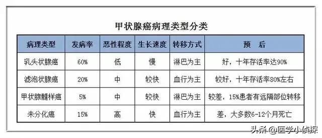 Il existe quatre types de cancer de la thyroïde : papillaire, folliculaire, médullaire et indifférencié. Le carcinome papillaire représente plus de 90 % de tous les cancers de la thyroïde et le taux de guérison du carcinome papillaire est supérieur à 95 % ; le plus malin est le carcinome indifférencié, qui représente environ 5 % de tous les cancers de la thyroïde, mais le carcinome indifférencié est plus fréquent chez les personnes âgées et progresse plus rapidement ; il meurt généralement dans les six mois.