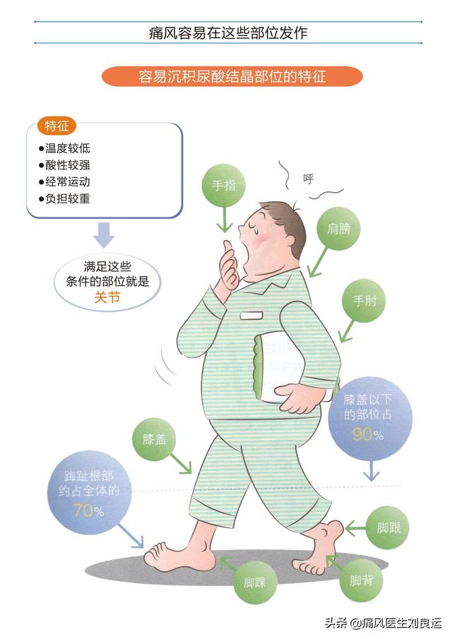 Les articulations qui peuvent remplir les conditions susmentionnées sont essentiellement les articulations des membres, et les premières articulations métatarso-phalangiennes sont les plus éloignées du cœur et ont la température la plus basse ; en outre, les premières articulations métatarso-phalangiennes assument une série de rôles tels que la marche, le soutien du poids du corps, le maintien de l'équilibre du corps et ainsi de suite, et supportent une charge et une pression plus importantes, de sorte qu'elles deviennent les plus sujettes aux crises de goutte dans les parties.