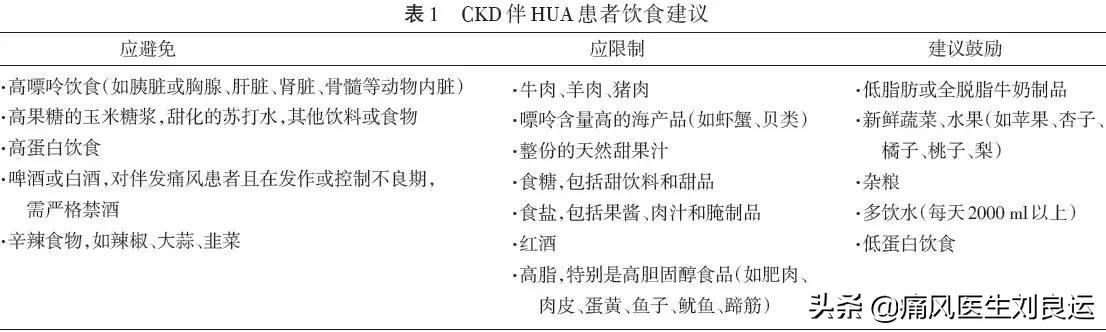 - Le déclin de la fonction rénale chez les patients atteints d'hyperuricémie est principalement traité de manière non pharmacologique :D'une manière générale, en cas d'hyperuricémie, il est recommandé de contrôler l'apport quotidien en purine, de ne pas dépasser 300 mg, d'arrêter de fumer et de boire de l'alcool, de manger plus de fruits contenant moins de fructose, de suivre un régime équilibré pour limiter l'apport calorique total quotidien ; de boire plus d'eau, de boire de l'eau en petites portions, et de boire plus de 2 000 ml d'eau par jour ; il est recommandé de faire plus de 30 minutes d'exercices aérobiques d'intensité modérée par jour, comme la marche, le jogging, la natation et ainsi de suite ; Dans la vie, contrôler le poids, éviter la fatigue, réduire la pression de manière appropriée et assurer le sommeil.