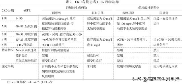 - La diminution de la fonction rénale chez les patients atteints de goutte détermine le choix des médicaments qui réduisent l'acide urique :En cas de goutte, un traitement pharmacologique est nécessaire parallèlement à un traitement non pharmacologique. En période de goutte aiguë, il est recommandé d'utiliser des anti-inflammatoires non stéroïdiens de la classe des inhibiteurs de la COX-2, tout en faisant preuve de vigilance en cas de lésions rénales, ou lorsque le DFGe est compris entre 30 et 50 ml/min, l'utilisation de la colchicine prescrite par le médecin pour réduire le DFGe <30 ml/min est interdite ; dans le cadre d'un traitement visant à réduire l'acide urique, l'utilisation de l'allopurine doit être prudente afin de réduire la fonction rénale chez les patients dont le DFGe est <15 ml/min est interdite, le fébuxostat est interdit. La dose initiale est de 10mg/j, aucun ajustement de dose n'est nécessaire chez les patients présentant une insuffisance rénale légère à modérée, la benzbromarone ne peut pas être utilisée chez les patients présentant des calculs urinaires d'acide urique, aucun ajustement de dose n'est nécessaire chez les patients présentant une insuffisance rénale légère à modérée ou un DFGe >60ml/min. Il est recommandé d'alcaliniser l'urine, un pH urinaire compris entre 6,2 et 6,9 favorise la dissolution des cristaux d'urate et leur élimination dans l'urine, mais un pH urinaire > 7,0 est propice à la formation d'oxalate de calcium et d'autres types de calculs.