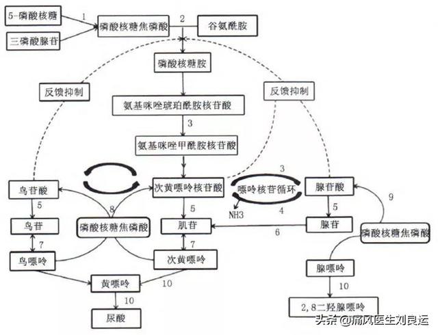 - Augmentation de la production d'acide urique :Il n'y a pas de haine sans cause ni d'amour sans raison, et l'acide urique ne vient pas de nulle part. La production d'acide urique dans notre organisme provient à 80 % de la synthèse des acides aminés, du phosphate de ribose et d'autres composés à petites molécules, ainsi que de la dégradation des acides nucléiques dans l'organisme, et à 20 % de la dégradation des nucléotides dans les aliments ingérés. La cause de l'augmentation de la production d'acide urique a été clairement identifiée comme une anomalie enzymatique héréditaire du métabolisme des purines, comprenant généralement un déficit en hypoxanthine-guanine phosphoribosyltransférase et une activité accrue de la ribulose phosphate pyrophosphate synthétase, entre autres causes.