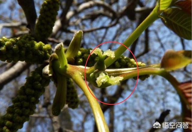Le noyer est monoïque, ses fleurs mâles ressemblent à des chenilles vertes, comme les fleurs de peuplier, et ses fleurs femelles sont beaucoup plus petites, encerclées dans l'image ci-dessous, l'arrière de la boule croît lentement.