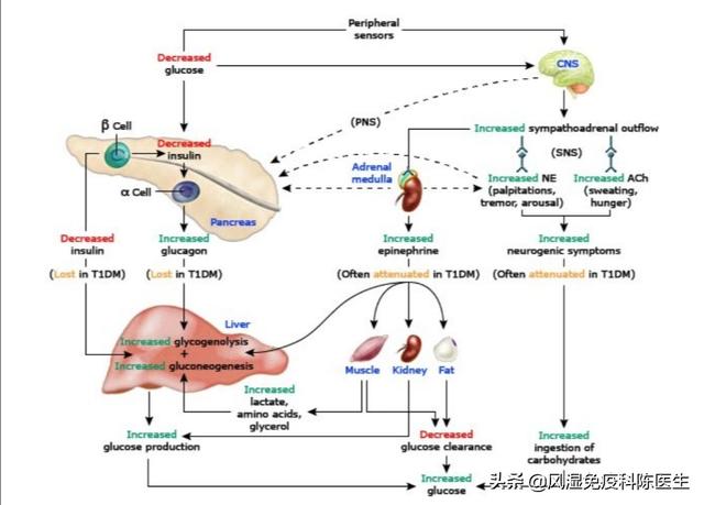 - L'augmentation de la sécrétion d'adrénaline, qui accroît également l'apport de substrats gluconéogènes à partir des tissus périphériques, inhibe l'utilisation du glucose dans certains tissus et supprime la sécrétion d'insuline.