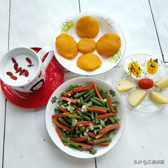 1, tortilla de citrouille à la vapeur, pratique : la vieille citrouille cuite à la vapeur et versée l'excès d'eau et mélangée dans la boue pour ajouter la vieille farine de maïs mélangée uniformément dans une forme ronde dans la casserole à la vapeur pendant 15 minutes, douce, douce, savoureuse tortilla de citrouille visible à la sortie du four ! 2, niébé froid mélangé à des bandes de carottes, niébé coupé en sections, carottes coupées en bandes dans la marmite, poisson bouilli blanchi à froid, ail écrasé dans la boue, ajouter la bonne quantité de sel, vinaigre blanc, huile de sésame, huile de poivre dans une sauce peut être arrosée. 3, 220ml de lait frais + baies de goji, 50g de pommes de terre vapeur, un oeuf dur dans l'assiette.