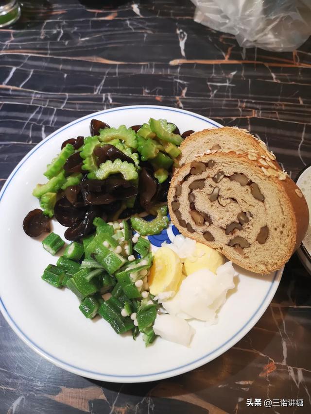 Melon amer, champignons, gombo Ingrédients : 46 grammes de melon amer, 15 grammes de champignons, 35 grammes de gombo, un œuf, mélange sans sucre de grains de noix Leba 65 grammes. Pratique : melon amer frit, champignons frits, melon amer et champignons dans le vinaigre, sel, sauce soja en petite quantité. Okra frit, rien à mettre. Œufs cuits et coupés, noix sans sucre, mélange de grains Leba 65 grammes. Lait de soja noir 150 ml.