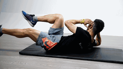 Deuxième étape :Levez les jambes et pédalez lentement. Expirez, soulevez le haut du corps et touchez votre genou gauche avec votre coude droit, maintenez la position pendant 2 secondes, puis revenez.