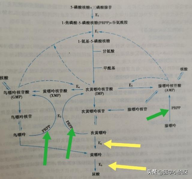 La première est l'augmentation de la production d'acide urique.L'acide urique est principalement dû au processus de métabolisation de l'acide urique par les acides nucléiques cellulaires dans notre corps.causée par une enzyme défectueuse.par exemplechiffreLa xanthine oxydase (E6) L'augmentation de l'activité accélère la conversion de l'hypoxanthine en xanthine, de la xanthine en acide urique, et de l'acide urique en oxygène.Les enzymes PRPP et PRPPAT du diagramme ne sont pas dans l'ordre.Tous ces facteurs peuvent également entraîner une augmentation de la production d'acide urique dans notre corps.