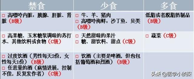 Le premier est bien sûr le contrôle diététique : les aliments à forte teneur en purine ne doivent pas être consommés ou doivent l'être moins, le terme "moins" faisant ici référence à un mois pour manger un peu, tant que l'on ne mange pas trop, pas trop souvent, une fois de temps en temps, l'addiction est également acceptable. Les abats, le bouillon et les produits de la mer sont à proscrire. Les autres légumes et fruits frais, les céréales complètes ne font l'objet d'aucun tabou particulier.