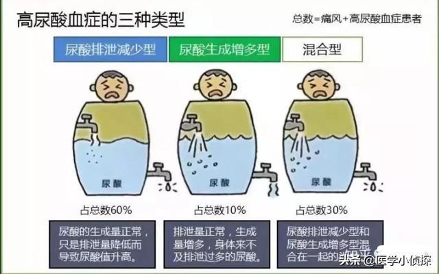 Si l'excrétion finale d'acide urique est <800mg/j (régime normal) ou <600mmol (régime pauvre en purines), il s'agit d'un problème d'excrétion ; dans le cas contraire, il s'agit d'un type de surproduction d'acide urique ; bien sûr, il n'est pas exclu que certaines personnes soient dans le type mixte.
