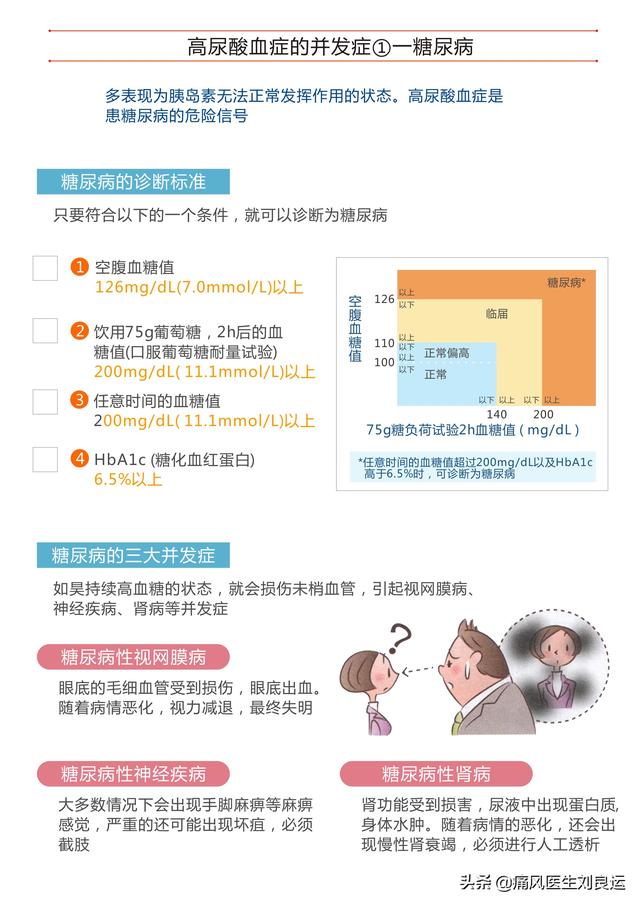 - (2) Diabète :L'hyperuricémie et le diabète sucré de type 2 sont deux composantes du syndrome métabolique et vont souvent de pair. Les principales raisons en sont une prédisposition génétique, avec des gènes autosomiques dominants ; toutes deux sont liées aux habitudes de vie, principalement sous la forme d'une alimentation irrationnelle, d'une consommation excessive d'alcool, d'une activité physique réduite, etc., et en particulier d'une consommation excessive d'aliments sucrés, qui entraîne une résistance à l'insuline et contribue aux troubles du métabolisme du glucose et à d'autres pathologies.