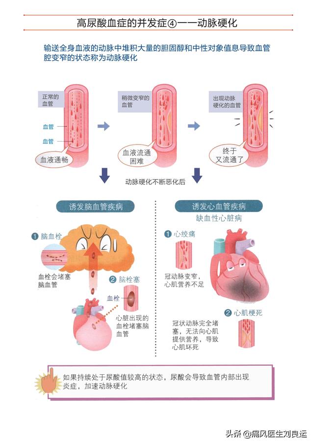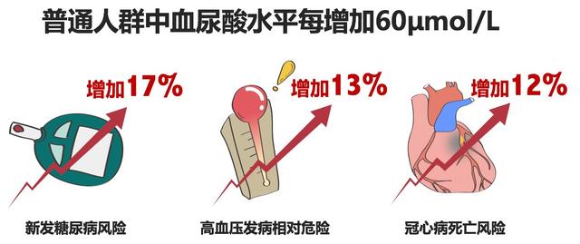L'hyperuricémie est un facteur de risque indépendant permettant de prédire la survenue d'événements cardiovasculaires, ce qui, en termes simples, signifie que plus l'acide urique est élevé, plus la probabilité de souffrir de maladies cardiovasculaires et le taux de mortalité sont importants. Une étude a montré que pour chaque augmentation de 60 μmol/L du taux d'acide urique, le risque de maladie coronarienne augmentait de 12 % par rapport à la normale. Parallèlement, les patients présentant un taux d'acide urique élevé sont également nettement plus susceptibles de souffrir d'infarctus cérébral et d'insuffisance cardiaque que les personnes normales.